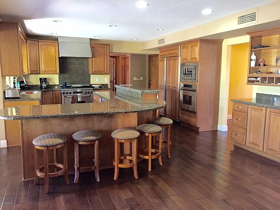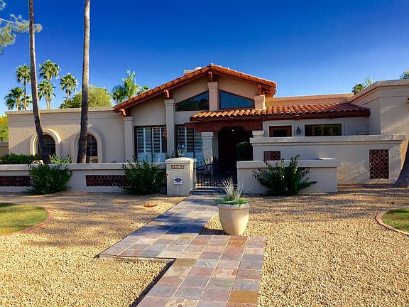 Perfect Family Home! This Ranch Style 5 bedroom +office/den home is situated on almost an acre in Stoneridge Estates, a quiet family community in North Scottsdale. The home was recently updated with 2 new water heaters, new carpets in 3 of the bedrooms, new landscaping and a complete remodel of the master bathroom all in 2014. Additional updates in 2006 consisted of an all new kitchen, new HVAC, remodeled bathrooms, and new wood flooring. The beautifully remodeled kitchen has all the upgrades one could ask for and offers great views into the huge and lush backyard that boasts a diving pool and spa, covered patio, built in BBQ, fire-pit, large grassy area and a lighted Sport Court. Other notable features include a large office with French doors and slate flooring!