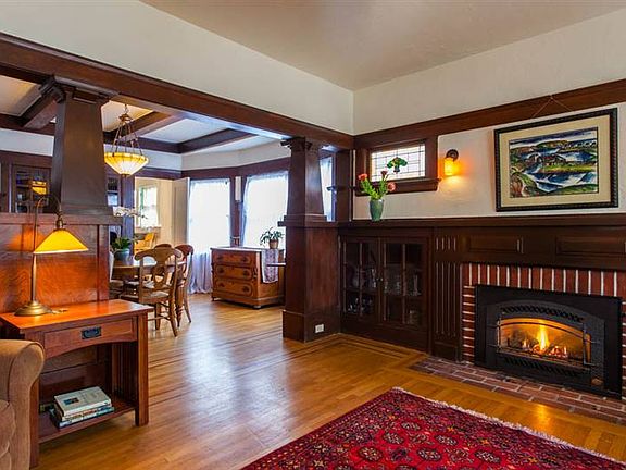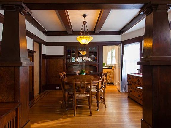 This lovely 1920 Craftsman home features unspoiled original details: wainscoting, beamed ceilings, built-in bookcases, little desk and china cabinet. The spacious foyer has an inset multi-paned window and two charming columns marking the entrance to the living room. The fireplace has been tastefully updated with a gas fireplace insert and artisan sconces add a special touch to the lighting in this warm and welcoming living space. The formal dining room with its bay windows, built-in buffet, linen storage and china cabinets is beautifully proportioned. The kitchen and bath have been updated. The bath features a tiled shower/tub enclosure, vintage style tile floors and a pedestal sink. The kitchen adds a modern touch to the home with plentiful cabinets and an L-shaped counter. An adjacent laundry room and pantry offer additional storage opportunities. The rear yard has potential with its size and level areas, but is as yet undeveloped. A partial basement offers ample storage and one of i