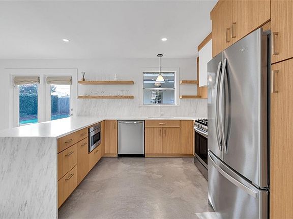 Come see this stunning brick GEM in Bonnabel Place! This Gorgeous 3 Bedroom, 2 Bath has been fully renovated with Stained Concrete throughout and the Open Floor Plan allows the Kitchen, Dining, and Living Room flow seamlessly together. The Living Room's Modern upgrades allow the Wood-Burning Fireplace and Mounted TV to centrally sit between sets of contemporary wood shelving. The Kitchen's sleek design with J-Pull Drawers & Cabinets, Marble Counters, Stainless Steel Appliances and Incognito Stove Hood create blended perfection. The Primary En Suite features Dual Sinks, Marble Counters and an Upgraded, Tile Walk-In Shower. 2 separate sets of French Doors lead to the spacious backyard Oasis with a Covered Patio overlooking the Inground Pool. This rare residence has been well-maintained, up-to-date, and is ready to create lasting memories for families, professionals, and anyone looking to experience the best Metairie has to offer! X Flood Zone!