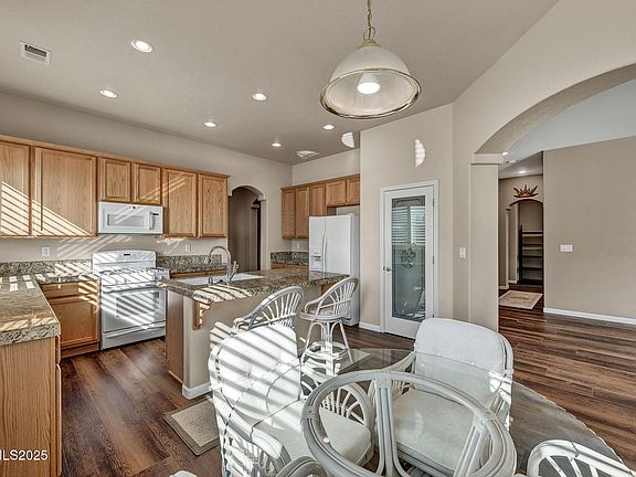 Located in the gated community of the Dayton Valley Golf Course. 3 bedrooms plus office/den, 2 full baths, 2,238 sf home features beautiful granite kitchen, island/breakfast bar and pantry. Large master bedroom suite with library or nursery, sliding glass door leading to the backyard, spacious walk in closet, separate shower and jetted tub. Luxury vinyl plank flooring, gas log fireplace, and plantation shutters. Awesome backyard with pavers, covered patio, yucca and fruit trees, artificial turf, and new Tuff Shed. Deep garage with a work bench, plumbed for soft water system and sink. Move-in ready.