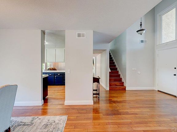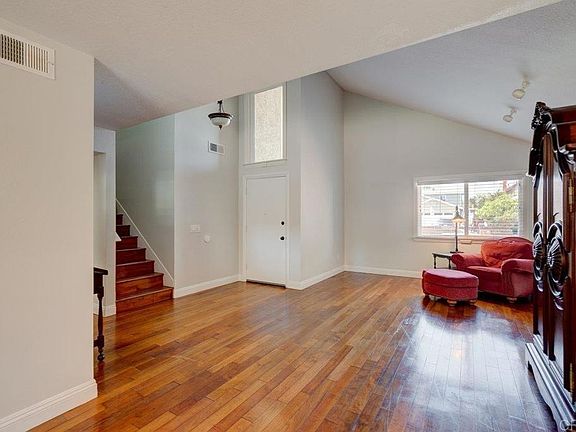 6 bedroom home back up to the canyon. Beautiful hardwood floors in LR, DR, Kitchen, Family, stairway and hallways. Vaulted ceiling in LR, breakfast bar in Kitchen, fireplace in FR. 2 bedrooms and 1 full bath downstairs. Upstairs is a Master Bedroom w/balcony, dressing room, double closets and shower. Huge bonus room counted as a BR can be an extra family room. The house was painted and new carpet installed in all the bedrooms last month. Central AC and Solar. Back yard has turf, bar with charcoal bar-b-que, beautiful fireplace, koi pond and shaded patio area. Built in sheds/storage area on side of house. Close to schools, shopping, restaurants, movie theatres, parks and golf course. Southwestern College is close by. Only a few minutes to CA125.