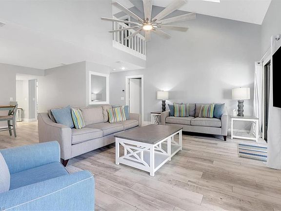 Beautiful remodeled end unit with lots of natural light and side view of the lake! This home has just been fully updated with the perfect coastal theme for your beach home! Beautiful light wood like floors, freshly painted walls and baseboards, light kitchen cabinets, and fully transformed back yard area including brand new fencing. This home is also nestled in a nice quiet cul de sac with a 1 car garage and driveway. The brand new flooring, paint and the beautiful back lanai/deck area with new fencing creates your own private oasis. This end unit has the primary bedroom on the ground floor and an additional guest room upstairs and a large loft/den serving as an extra bedroom. All with gorgeous amount of natural light! This home also has a powder room/half bath on the ground floor which is great for guests. Pelican Ridge has 2 heated community pools and is in a prime location in Naples. Just over 1 mile to Vanderbilt Beach and across from the hotspot Mercato, shopping, dining and more. The relatively low HOA fees include the pools, lawn/landscaping, water, pest control, roofs/exterior insurance of home and reserve. Pack your bags and move right in!