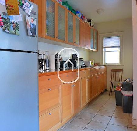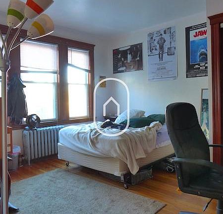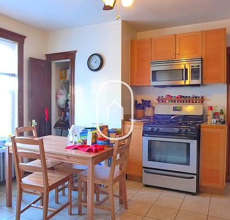 Sun-drenched top-floor apartment Four spacious bedrooms Renovated eat-in-kitchen with dishwasher/disposal Cozy living room Gleaming hardwood floors and beautiful wood trim throughout Two porches, front and back No security deposit required Laundry facilities in building Located in Mission Hill Friendly mom-and-pop landlords Free on-street parking nearby and off-street parking available Owner pays for trash, sewer, water