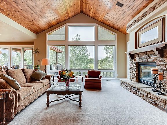 Magnificent custom rancher in the golf course community of Kings Deer in Monument. This 5 bedroom, 4 bath home features almost 5,000 sf and is situated on 2.57 acres with great views. Open floor plan with tongue & groove wood ceiling in the vaulted great room that includes a stacked stone gas burning fireplace with a custom Alder mantle and a wall of windows to bring the outside in. The oversize formal dining room is perfect for large family gatherings. The gourmet kitchen is a cook's dream with slab granite countertops, center island, a huge wrap around bar with seating, double wall ovens, a pantry and a breakfast nook that walks-out to the covered composite deck. The bright and airy vaulted master retreat has a walk-out to the deck, his and her closets and a spacious 5 pc. spa with soaking tub. One additional bedroom is on the main level. The lower level features an oversized walk-out family room and a game area with a wet bar, three additional bedrooms, two with walk-in closets
