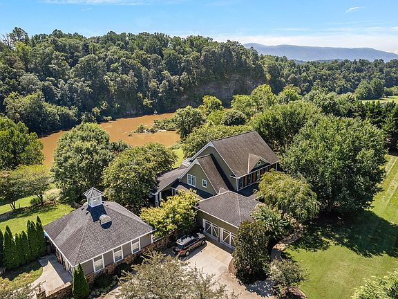 What a magnificent property right on the Nolichucky River in beautiful River Plantation Subdivision. You will find sitting on 3.33 acres, nearly 5,000 square feet of finished space. From the finest relaxing to entertainment or your own private retreat and sanctuary, this property has it all. From the moment you arrive and step foot on the well-kept and maintained property, you'll see where luxury meets tranquility. The front entry way lets you sneak a glimpse of the gently flowing river through the glass doors that lead out the slate lined patio. To the left of the entrance, an elegant dining room, and to the right, a sitting room or could be office space. The doors to this room were hand selected to add a touch of modern style.