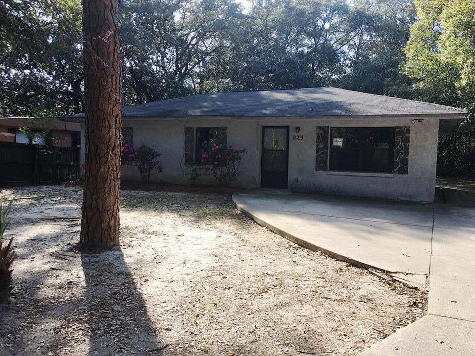 This three bedroom stucco home is located on a street with little traffic. The floor plan is ranch in style . The living room is open to the dining area. The kitchen is spacious plenty of counter space and cabinets. French doors lead out to the huge back yard off the dining area the yard is surrounded with large shade trees.
