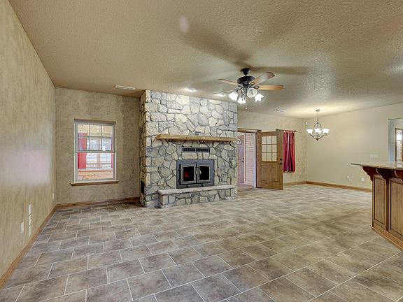Incredible 1 level home on 2.25 acres with detached workshop! Covered front porch, private entry, attractive great room opens to amazing kitchen with granite counters, large island, Twin Oaks cabinets, walk-in pantry, bar seating, dining area, double sided fireplace, wonderful family room with knotty pine walls and ceiling shares double sided wood burning fireplace with great room, 16x15 master suite with luxury bath, double sinks, jetted tub, walk-in shower, security system, whole home generator with propane tank, central vac, radiant heated floors, all tile flooring, carpet in bedrooms, new hot water heater 2019, pergola sitting area in back, beautiful setting, oversized 2 car attached side entry garage, separate detached 30x40 garage / workshop with garage doors on each side!