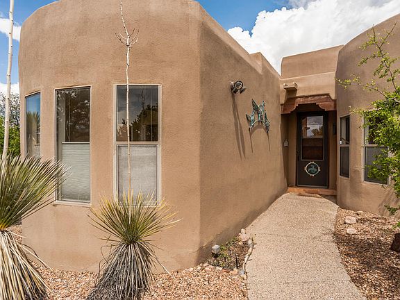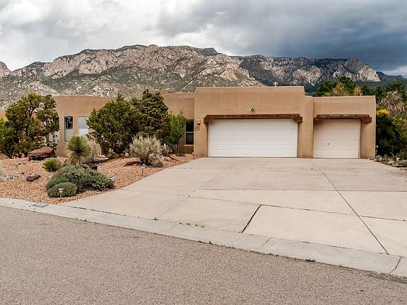 Spectacular home in southern Sandia Heights with large, park-like lot. Glorious views of the mountains from backyard, patio, MBR, LR and DR. Enjoy the lovely back yard setting from the hot tub! Open, light-filled great room with inviting Kiva FP. Fabulous floorplan, cathedral ceilings, sky lights, saltillo, vigas. New granite counters. All sun drenched bedrooms generously sized. 3 car garage. This home has so much to offer!