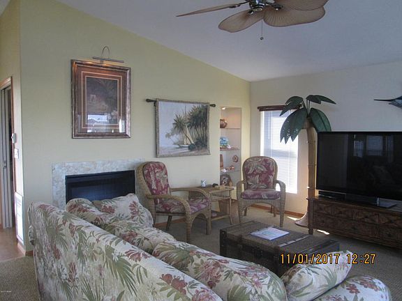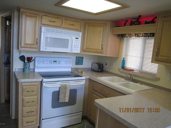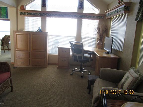 This Park Model is different then any other in the park. Lots of room and lots of storage and much more. Beautiful Living Room with fireplace. Nice Galley Kitchen. Currently the eating table is in the living room and the dining room is used as an office, both rooms are very large,There is a Loft up above with a Queen size bed.Laundry room on first floor, There are steps down from the Laundry room with a nice work area or possible 2nd bath.Really nice patio area in back next to the pond, beautifull views.In front there is a large covered parking area plus a storage area.Lanscaped nicely.15.6X12 covered Parking, 12X10 Uncovered Golf Cart Parking.Hard to explain this home - must see