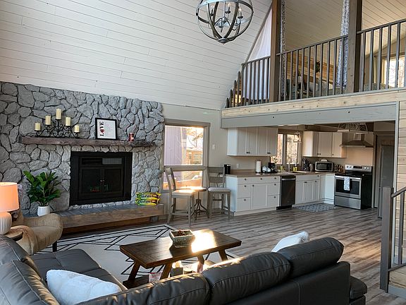 Beautiful furnishingsWood burning fireplaceBlow dryerOpen conceptCedar wallsExposed beamsBlackout shades