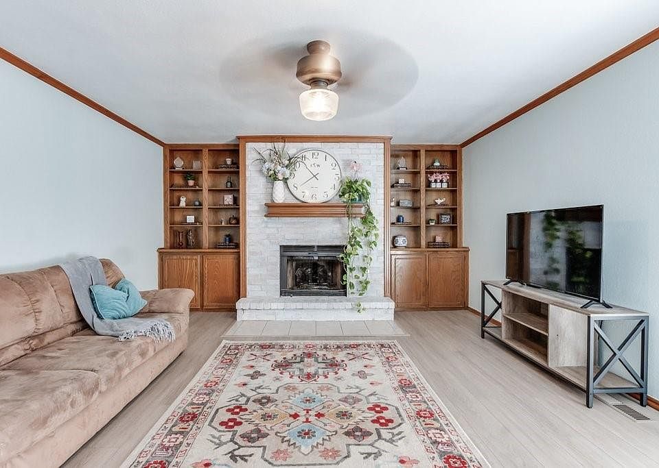 Step inside to discover two inviting living areas; one intimate and inviting, and the other flooded with natural light and a gorgeous fireplace adorned with built-ins.