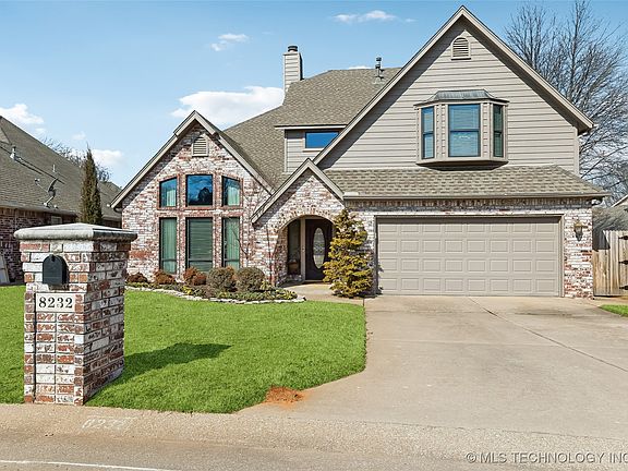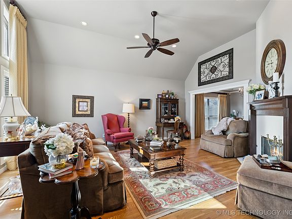 This 4 bedroom home in Jenks East Elementary district is immaculate and expertly maintained. Large lot with manicured extended patio for outdoor living and play. Gorgeous refinished hardwood floors, vaulted entry. Formal living with a gas fireplace is open to formal dining. Granite kitchen with abundant cabinetry is open to cozy family room with second fireplace & breakfast room. Updated primary bathroom with custom tile, leathered granite & designer finishes. Attic build out space for future expansion. New carpet throughout. New Thermal Windows with lifetime transferable warranty. One of the largest lots in the neighborhood. Close to schools, shopping, restaurants and easy access to downtown Tulsa via Riverside drive.