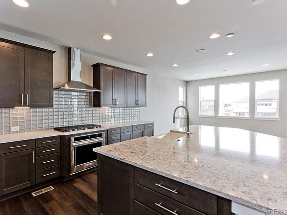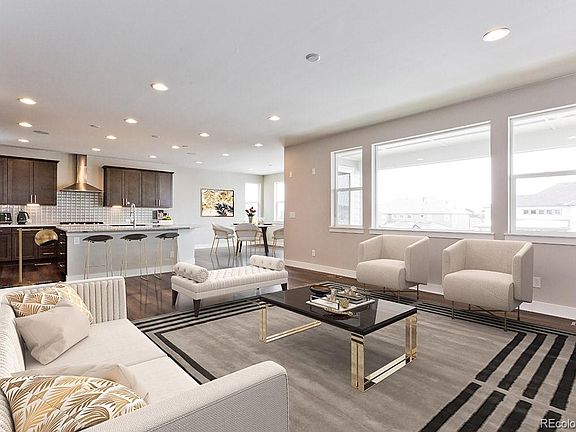Move-in ready! Incredible, brand new luxury home on a walkout site with a covered deck and backing to a greenbelt. Stunning 'model home' inspired finishes; stainless steel KitchenAid appliances, shaker style charcoal cabinets, Cambria quartz countertops, farmhouse style sink, hand troweled walls, plus a finished basement complete with a rec room, bedroom, bath and bar! Enjoy the many amenities at Whispering Pines: the Outlook community center & pool, 24 acre park, two community trail systems - Sampson Gulch Trail and Piney Creek Trail and miles of connecting trail systems nearby.Taxes are TBD - taxes are currently assessed on land value only and not on the total value of the property. Est. annual taxes are approx. 1.24% of purchase price. HOA is a metro district and fees are incorporated into the property taxes. Some photos have been digitally altered and enhanced. Refrigerator is not included. All furniture/artwork, décor are digital and are an example only. Front yard landscaping is included, however grass has been added for demonstration purposes only.