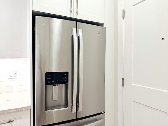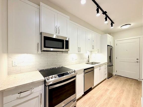 White quartz countertopsWhite shaker cabinetsVinyl-plank floorsBuilt-in closet organizersWest facing patio