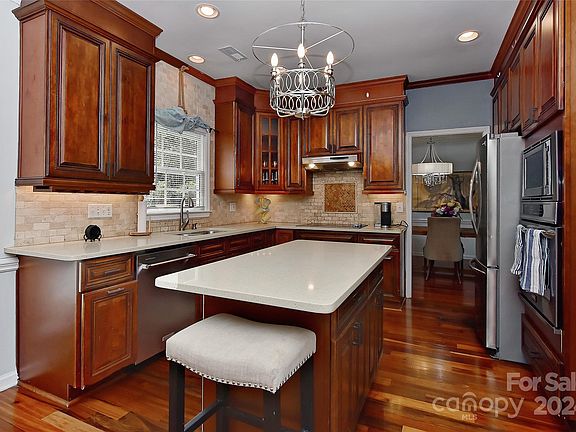 Updates include smooth ceilings, fresh interior paint & new carpet in all bedrooms. Eye-catching engineered wood flooring accents the main level and upper hallway. Elegant living room & formal dining room are open for easy entertaining. Inviting family room with masonry fireplace is open to the kitchen. The kitchen features solid surface countertops, tumbled stone backsplash, stainless steel appliances and center prep island with bar seating. A deep trey ceiling highlights the primary BR with tiled bath, double vanities, garden tub, separate shower & walk-in closet. Awesome fenced back yard with mature shade trees and huge custom patio with partial covering & knee-wall accent! Minutes to Blakeney shopping center and Stonecrest! Community House Middle School and Ardrey Kell High School are within walking/biking distance. Home is located in the back of neighborhood, so there is little traffic by the house.