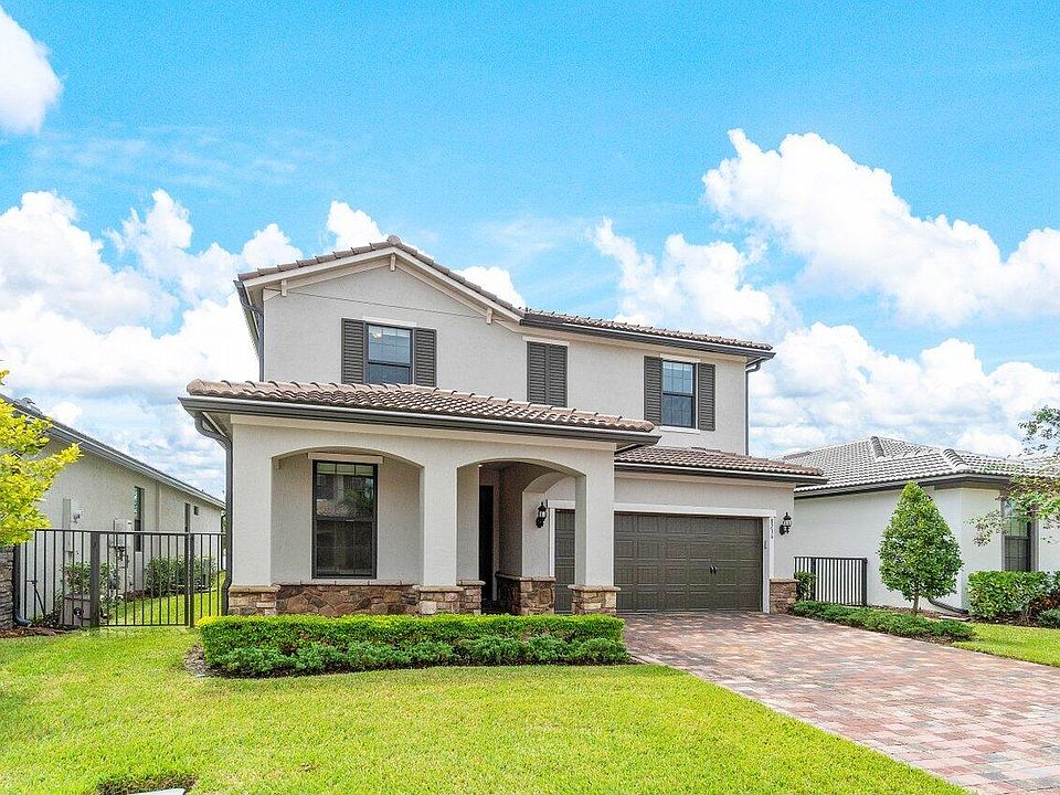 A stunning property awaits you in the sought-after gated community of The Fields by Divosta. This Fifth Avenue model, single family home featuring 3 Beds, 2.5 Baths, a downstairs Den and 2 car-garage, boasts an eye-catching exterior stone elevation that adds to its curb appeal! Step inside and be greeted by 2,404sqft. of thoughtfully designed living space. The covered entryway leads to 8-foot doors throughout, creating an atmosphere of grandeur and spaciousness. The heart of the home is an open concept kitchen, dining, and living area that is perfect for entertaining or relaxing with loved ones. This space features upgraded elements such as a stylish backsplash, sleek quartz countertops, and top-of-the-line stainless steel appliances. The attention to detail is evident in every corner. Adjacent to the kitchen is a bonus office nook, ideal for those who work from home. A convenient mudroom off the garage entrance keeps things organized and tidy. The fenced backyard offers a tranquil retreat with serene lake views, providing a picturesque backdrop for outdoor activities and gatherings. Upstairs, discover a generously sized loft that can be utilized as a versatile space to suit your needs. Two guest bedrooms and a guest bathroom with a dual vanity and shower/tub combo provide comfortable accommodations for family or visitors. The primary bedroom is a true retreat, boasting ample space and sophistication. The en-suite features a dual vanity and an extended shower, Floor-to-ceiling tile, custom mirror, and walk-in closet. Every aspect of this home has been carefully considered and crafted to create an atmosphere of luxury and comfort. Additional features include impact-resistant windows and doors that provide peace of mind, a covered patio for enjoying the outdoors rain or shine, and custom window treatments that add a touch of elegance to each room. This energy efficient home offers not only a beautiful and functional living space but also an ideal location. Located within a short distance of the amenity center showcasing a state of the art fitness facility, tennis and basketball courts and a beautiful resort style pool. The Fields by Divosta is a gated, master planned community with low HOA fees, located minutes from nearby shopping, dining, A-rated schools and adjacent to the Florida Turnpike! Don't miss the opportunity to make this exquisite property your own. Schedule a showing today and experience the luxury and comfort this property has to offer.