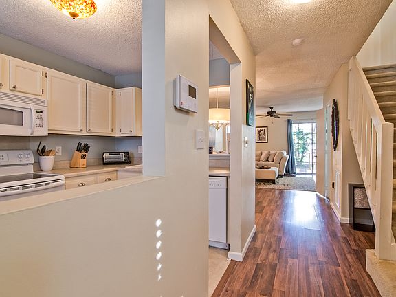 Adorable end unit w/covered porch; very spacious open plan w/wood laminate floors, bright kitchen, fresh neutral paint throughout, updated light fixtures. Two huge bedrooms each w/private bath. Laundry up w/full size washer/dryer. Easy entertaining w/shaded deck. So convenient to shopping and restaurants. 2 parking spaces and affordable HOA. This one won't last - don't miss it!