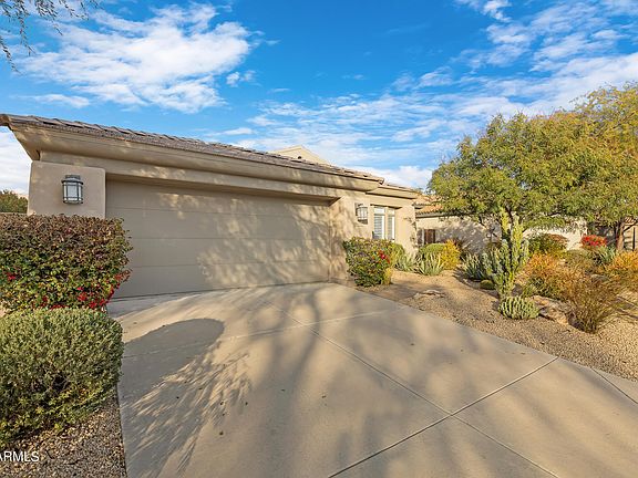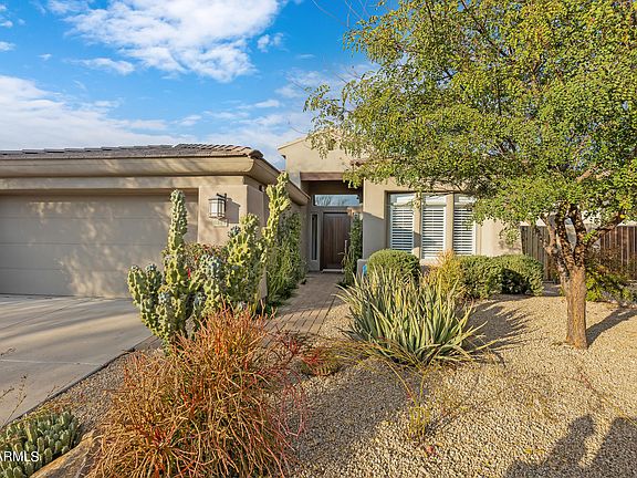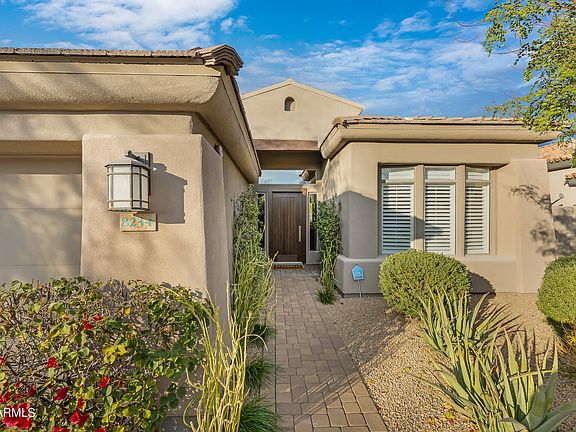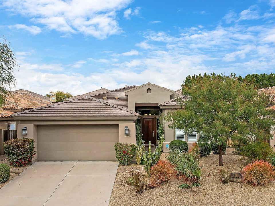 Stunning remodeled home in the highly sought after community of Grayhawk. Cherry wood cabinets, leathered granite countertops, and GE Cafe Series appliances create the perfect kitchen. Gas fireplaces were added to the living room and master bedroom. In the office, a queen Murphy bed makes the space functional for everyday use and guests! Both bathrooms have been fully renovated with new vanity cabinets and custom tile showers. Step outside into your own private oasis with a water feature, above ground hot tub, gas firepit, and BBQ. Plantation shutters throughout, new roof in 2020, tankless water heater installed in 2021, water softener, and reverse osmosis. This home truly has it all. Crown Point is also home to a community pool and private tennis courts for its occupants to enjoy!