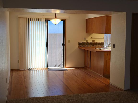 Large open Living/Dining area. Living (15'x16'), Dining (10'x12'). New carpet, vinyl and wood laminate flooring. Sliding glass door to fenced in patio /deck. Kitchen has lots of hardwood cabinets and pantry closet, pass through to counter-top in dining room. Stove, fridge and dishwasher provided. Laundry room upstairs with washer/dryer hookups off central landing. Updated bath with new fixtures, water saving toilets and stylish paint. + 1/2 bath downstairs. New high efficiency forced air gas heat furnace. Large bedrooms (10x12) and (12x15) have extra large closets + ceiling fan/lighting. Security screen front door opens onto central courtyard. Semi-gloss paint throughout for easy upkeep! New landscaping and privacy fencing in the upcoming year! Close to Max line (3 blocks away), Convenient to shopping. 50 application fee Owner pays for garbage, water and sewer. Tenant pays gas, electric, cable. No smoking or vaping in apartment complex.