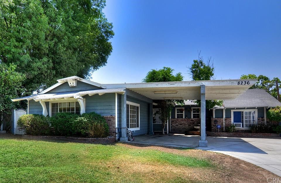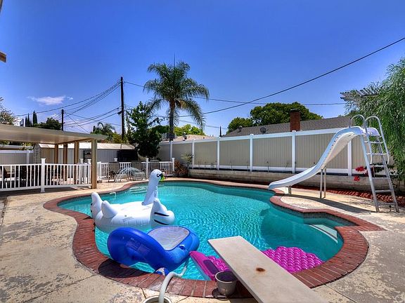 Great opportunity to get yourself a pool home at a great price. This 4 bedroom 2 bath home offers 1769 feet of living space, a corner lot, upgraded kitchen with newer cabinets, granite counter tops, tile and laminate flooring throughout (no carpet), very spacious living room, both bathrooms have been upgraded, large backyard with pool, alumawood patio cover with recessed lighting, new vinyl fencing on 2 sides with block wall on the third. The home was originally a 3 bedroom but the owner had the garage converted with permits, into a huge bonus room with walk in closet at over 400 sq ft. The owner is currently using the bonus room as her Master Bedroom. Currently bedrooms 3 and 4 have been opened up by removing a wall to make one huge bedroom. Could very easily be converted back into 2 smaller rooms. Although the garage was converted, there was a large storage shed added to the backyard that is 10' x 30'. When the conversion was done, the laundry room was put into the home. The home is located in a nice neighborhood and close to stores, fwys, malls, and schools and a great place to call home!