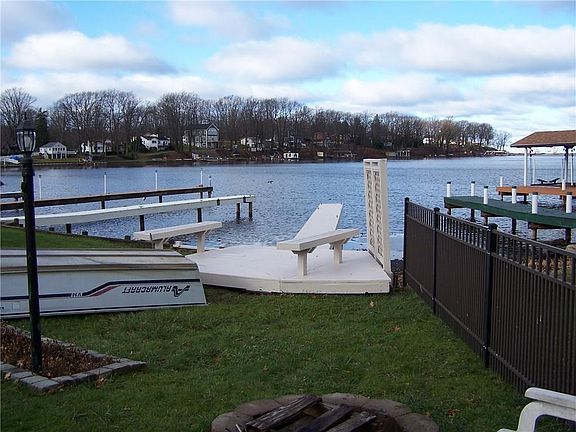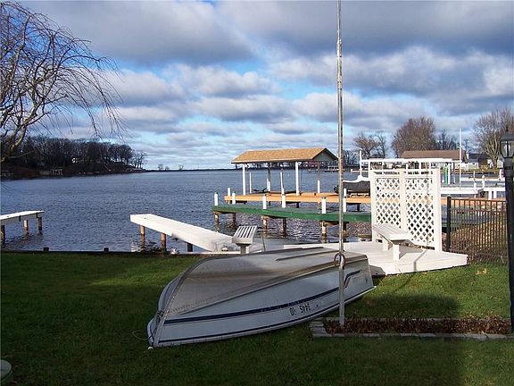 WONDERFUL 2 BEDROOM RANCH COTTAGE on 15' of LEVEL PORT BAY WATERFRONT w/ permanent dock. Enjoy the large bayside deck with beautiful Northern views of the water. This completely remodeled cottage interior has been tastefully decorated throughout with open concept and 2 large bedrooms. Updated kitchen, bathroom, windows & doors! Cottage comes FULLY FURNISHED!! The 3 CAR GARAGE (contents not included) has electric & concrete floor to hold all the toys. Purchase also includes playset & above ground pool w/deck! Connected to public water & sewers. Cable & High Speed internet available! Port Bay offers channel access to Lake Ontario and many nearby attractions just minutes away! Public record has square footage as 600 but it is 900 sq ft due to the fact the owner took down walls, turned porch into bedroom and rearranged layout.