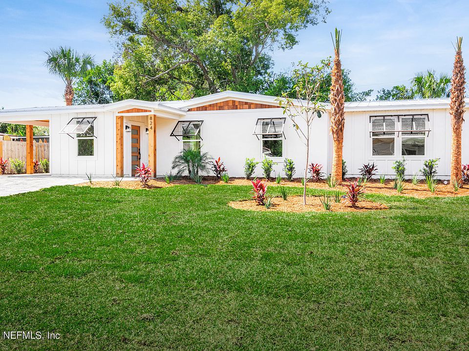 Welcome home to sunny Atlantic Beach! This home has been gutted down to the shell, then fully rebuilt from top to bottom. The biggest transformation is a nearly 500 square foot addition to include a new primary bedroom ensuite. New [corrugated metal roof, HVAC system, water heater, plumbing and electrical systems all updated in 2024. The professionally designed interior boasts an open concept living space with LVP throughout and recessed LED lighting. The designer kitchen includes new white shaker cabinets, quartz countertops, and stainless-steel appliances. The primary bedroom suite has tons of natural light, a huge walk in closet, and luxurious ensuite bathroom. The exterior was resided, and the yard fully landscaped complete with new irrigation system, new paver driveway and patio, and termite bond completed January 2024. The whole house was reinsulated including spray foam in the attic for maximum efficiency.