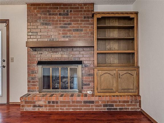 Designer leaded glass door greets you as you approach this home. Hard surface flooring throughout includes beautiful hardwoods in Living Rm & all Bedrooms. Tile in Entry, Kitchen, Dining, Laundry, Hall, & Baths. Light & bright Kitchen w/ neutral counters, gas range & tile splash. Dining features built in china hutch and bay window that overlooks the front lawn. Oversized Living Rm has a brick fireplace with gas logs. Atrium doors that lead to East facing large back yard and patio. You will love the recently updated guest Bath with furniture like cabinets! Large Master Suite on back of home has a step in shower and HUGE walk-in closet! Water softener, security system, storm shelter, and low maintenance exterior siding are just a few of the additional features this home has to offer. Nicely maintained & updated.