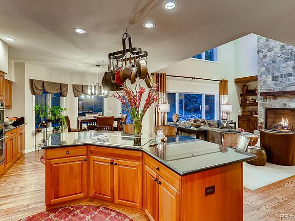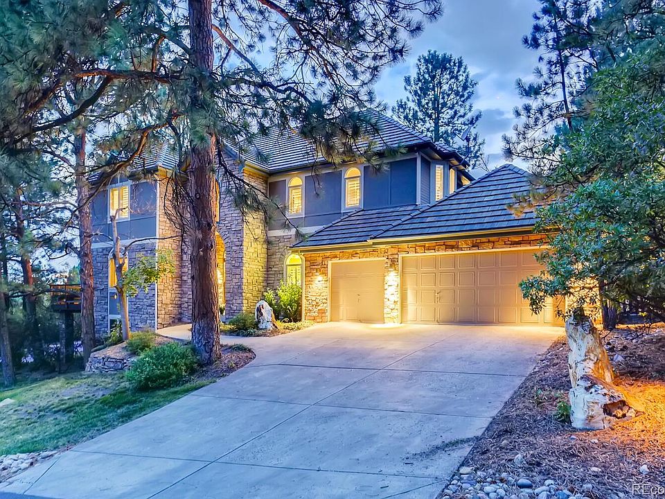 Nestled among the towering pines in Castle Pines Village, this contemporary mountain estate offers a luxurious lifestyle, amazing mountain views and a warm yet sophisticated ambiance. Perfectly poised on a cul-de-sac corner lot, the street appeal alone is striking! Welcome the outdoors inside with walls of windows throughout, several outdoor entertaining areas, including an upper level deck off the living room, perfect for dining alfresco or winding down from the cares of the world with a glass of wine overlooking the gorgeous Rocky Mountains. The main floor showcases an intimate living room flowing effortlessly into the dining room and continuing to a well-appointed gourmet kitchen. Be prepared to be wowed by the two story great room with a beautiful fireplace as the focal point. The stately office is perfect for the work at home executive or to cozy up with a good book. Elegance at EVERY turn! Wander to the upper level to find a lavish master suite with romantic, recently updated spa-like master bathroom. Two generous secondary bedrooms with Jack n Jill bath, plus a third ensuite bedroom. The lower level is an entertainers dream! Open air theater, recreation room, European serving bar, walk out to a private patio, or escape to the guest suite! All of this while enjoying this gated, exclusive neighborhood with numerous amenities! Recently updated with Bosch appliances. Standalone icemaker in bar, kitchen refrigerator, and gas range. House may be sold furnished. New Marantz sound system included. Amazing audio -video components. Stunning 8’ antique pool table in bar. This is the house to entertain and live the life you have always wanted. Take the golf cart to the bar, fitness center, pool, restaurants or Tony’s market. It’s a lifestyle choice you will love.