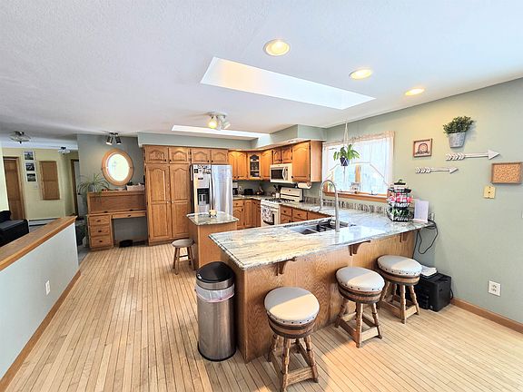 Welcome to this charming hillside home offering everything you've been looking for and more.  The property impresses with its expansive, open lot and the thoughtful placement of the home, which maximizes the stunning views.  The kitchen boasts an open-concept design featuring beautiful granite countertops, oak cabinets, and skylights - making it the perfect place for cooking and entertaining.  The primary bedroom suite is a true retreat, complete with a spacious bathroom and a luxurious whirlpool tub for ultimate relaxation.  Additionally, the first floor includes another generously sized bedroom and a full bathroom.  The tiled foyer entry enhances the home's functionality with a coat closet and laundry just steps away from the front door.  The finished basement offers an open-concept layout as well, with a wood stove, walkout slider, full bathroom, two bedrooms, recreation room and a utility room.  Of note, the recreation room appears to have plumbing in place for a second kitchen.  Other key features include a gutter system, detached shed, heated three bay garage with water spigot and workspace, portable generator hookup, recently replaced roof, water softener system, and the expansive 8x40 front porch where you can take in the magnificent views.  Direct access to snowmobile and ATV trails.  Just a 15 minute drive to shopping, golfing, restaurants, and hospital access.  Schedule your showing today and experience all this beautiful property has to offer.