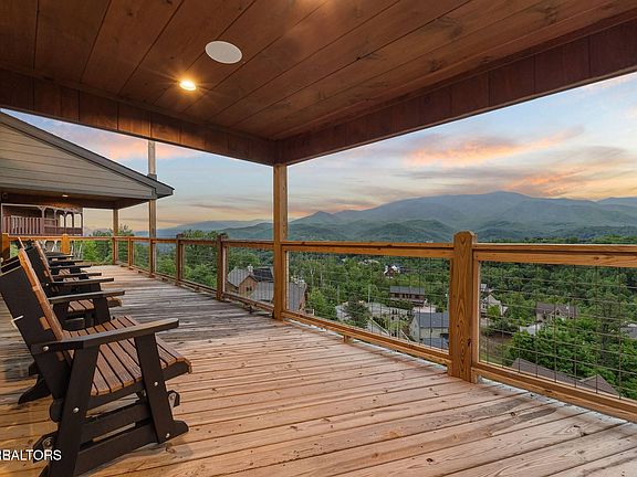 Perched high in the sought-after Chalet Village of Gatlinburg, 'Breathless Views' offers front and center views of Mount LeConte. An unparalleled investment in mountain luxury and unforgettable experiences. With breathtaking, unobstructed views of the Great Smoky Mountains, this custom-built 4-bedroom, 5.5-bath retreat is ideal for those seeking a top-tier short-term rental or a private mountain getaway. Designed with exceptional craftsmanship, the home features an open layout, a master ensuite on the main level, a spacious kitchen with custom cabinetry, and soaring floor-to-ceiling windows that showcase the stunning Smoky Mountain views. The upper level offers two private ensuites and a cozy nook perfect for reading and soaking in the scenery. The lower level is every vacation guest's dream with a well-outfitted game room, spacious theater, full bathroom, and another private ensuite. Enjoy the outdoors with an expansive deck, private hot tub, and a custom stone fire pit on the lower deck. With its prime location just minutes from Gatlinburg and Pigeon Forge and close to the Great Smoky Mountains National Park, this home is outfitted for maximum short-term rental potential and includes access to Chalet Village amenities like pools and tennis courts. This property is the perfect blend of luxury and investment opportunity!