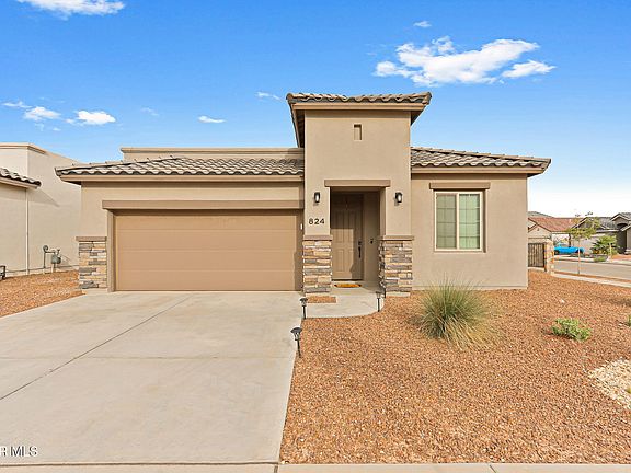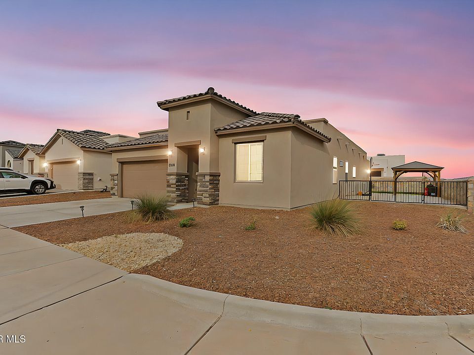 This nearly new, single-story home offers the perfect blend of style, comfort, and functionality in a growing neighborhood. Situated on a spacious corner lot, it showcases beautiful curb appeal with rich brown-tone accents, and cultured stone details. Step inside to a welcoming office with French doors, then flow into the open-concept living space. The gourmet kitchen features an oversized granite island with bar seating, sleek stainless steel appliances, recessed lighting, and a walk-in pantry. A subway tile and mosaic backsplash with glossy white finishes add modern elegance, all seamlessly connected to the dining and living areas that open to the backyard retreat. The primary suite ft. tall ceilings w. leveled accents, and a spa-like bath with a soaking tub, a stone-and-tile walk-in shower, dual granite vanities, and a spacious walk-in closet with built-in shelving. Out back, enjoy a private oasis with a covered patio w. recessed lighting, and a gazebo for extra shade—ideal for relaxing & entertaining!