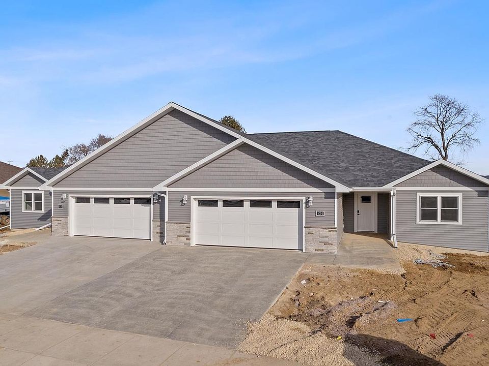 Welcome to Greenfield Reserve - Your Home for New Beginnings! This ZERO LOT LINE offers an open concept, 2 bdrms, 2 baths, main level laundry & covered back porch with a view of the bluffs. Enjoy quality finishes including Amish-made self closing cabinetry, Malarkey roof, Quartz counters, LVP flooring & stainless appliances. Lower level has egress windows and stubbed bathroom for future expansion. Each 2-car garage features an electric vehicle charging port. Neighborhood perks include city sewer/water, sidewalks, future park & conservancy with trails! Less than one hour drive to either side of Madison!