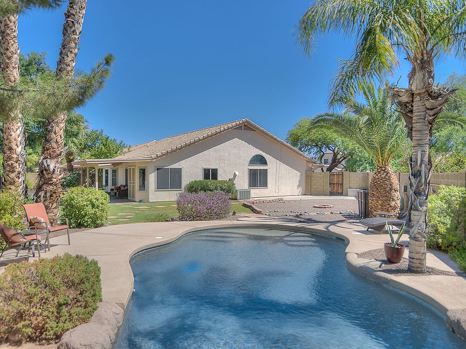 Resort style backyard with sparkling salt water pool! Situated on a premium oversized lot in the heart of San Marcos Estates, this single level Lennar home features nearly 1,800sf of expertly utilized space with 3 bedrooms, 2 bathrooms & upgrades throughout. Set at the end of the Cheri Lynn block for ultimate privacy, this home shines with a formal living & dining room with double door entry bedroom perfect for a home office or guest suite. The eat-in kitchen has been remodeled from top to bottom with cherry shaker cabinets, slab granite counters, upgraded fixtures & an extended island with breakfast bar seating into the family room. The large master suite boasts a full ensuite bath with separate shower & tub, oversized walk-in closet & a private toilet room while the additional guest... bedroom, full guest bath & laundry room complete the interior space. Outside, relax in your private oasis with a pavered covered patio complete with furniture & bistro lighting, built-in BBQ & resort style salt water pebble tech pool and rock water feature. With seating areas all around the oversized lot & extra parking in the driveway, you'll be the envy of your friends & family and certainly the site of many gatherings in your new home. Within walking distance to San Marcos Park & Elementary School, near the 202 and Arizona Avenue for easy access to the rest of the Valley, and just minutes from the shopping and dining of downtown and South Chandler - this one won't last long!
