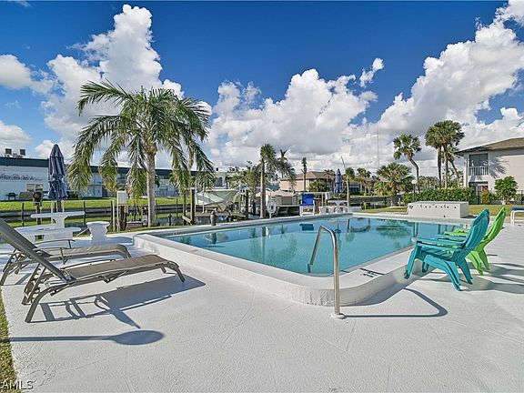 Beautifully remodeled 1st floor 2/2 corner-unit condo with southern exposure. Updates include renovated kitchen, including new cabinets, solid surface countertops, appliances and stone backsplash. NEW 18" TILE THROUGHOUT. The living room leads to a large glassed-in lanai that overlooks the meticulously maintained yard, pool, gulf access canal, and PRIVATE DEEDED DOCK. The lanai has an updated tile floor and large closet for extra storage. Unit includes a boat slip and entitlements for a lift. Open water is only a short-trip and 1 bridge. The large master bedroom shows like a model and has a large walk-in closet and fully remodeled modern bathroom. The second bedroom is spacious with custom built-ins and additional bonus room that could be used as a small office or extra storage. Your new Florida home has updated bathrooms with new vanities, countertops, shower doors, and lighting. All window coverings are newer and the doors are all raised panel. All windows have been replaced with IMPACT RESISTANT WINDOWS with the exception of the kitchen window. Nothing to do here but enjoy the FL sunshine! The complex is quiet, well-maintained, and convenient to downtown Cape Coral.