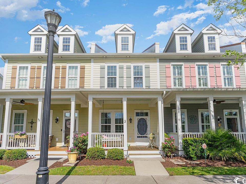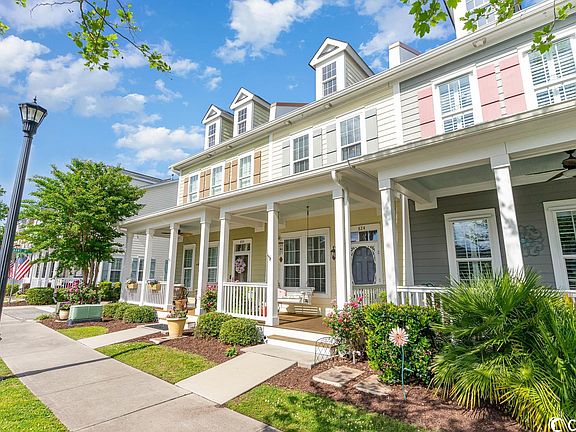 There is no place like The Market Common! This home is located within walking distance or golf cart ride to the ocean, restaurants, shops, dog park, playground, walking paths and movie theater in the sought after community of The Market Common. The inviting front porch welcomes you in, perfect for watching the beautiful sunsets and visiting with the neighbors. You will appreciate the many charming details that make this house a home, like the hardwood floors throughout the first floor that continue up the steps. The kitchen offers granite countertops and GE appliances. There is a large owner's suite and bath with separate garden tub and shower, with plenty of room in the oversized walk-in closet. The second bedroom has it's own private full bath, perfect for your guests. Park your car and golf cart in the oversized 1.5 car garage, with a storage area. You will enjoy the open feel with high ceilings on 1st and 2nd floor, the comfort of natural gas heat and tankless hot water heater. HOA includes insurance, lawn care, irrigation, cable, internet and the amenity center with pool, lazy river, clubhouse, gym and hammocks. The best the beach has to offer! Owner is Licensed Realtor. Refrigerator in garage and porch swing do not convey.