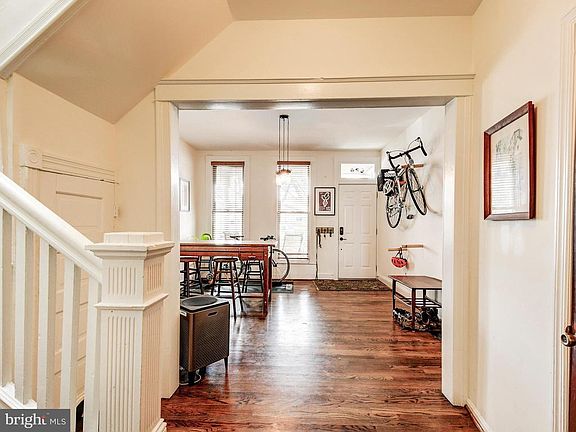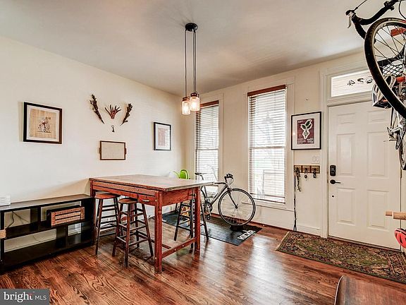 Skylights and high ceilings make this open floor-plan Baltimore rowhome feel light and airy, with a unique atrium that brings sunshine into the middle of the house. Front bedroom includes original stained glass transom windows and floors; hardwood floors throughout both floors. Second-floor laundry, with additional laundry in basement. Front and back yard are fenced in, rear can be used as parking.