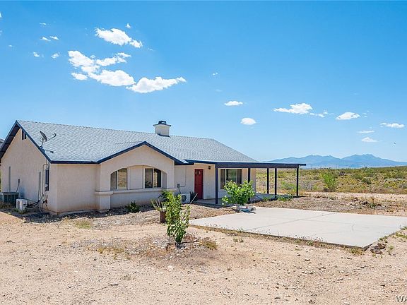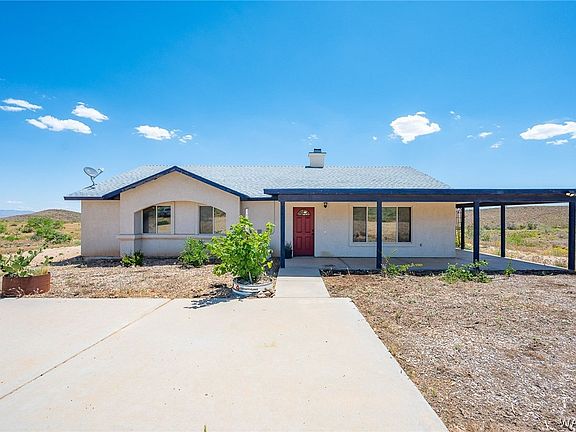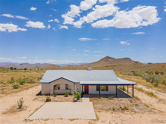 Experience stunning Hualapai Mountain views from the expansive patio that wraps around two and a half sides of this amazing 11-acre property. Enjoy fresh fruit from the apple, fig, and pomegranate trees, blackberry bushes, and fresh eggs from your chicken coop. A homesteaders dream home. Central A/C but also enjoy saving on utilities with the 4 recently installed split units. One in the living area and one in each bedroom. The bright open floor plan and new tile flooring create a spacious and modern feel, while the great-sized pantry and laundry area provide ample storage space. Huge picture windows in the living and dining area have been tinted to let in all the light but less of the heat. New beautiful ceiling fans recently installed and new French doors in the primary bedroom for easy access to the perfect patio seating area. Parcel 331-15-020A&B including in the sale with plenty of usable land to build your dream garage. Don't miss out on this unique and beautiful property! Do not use GPS, follow directions in listing.