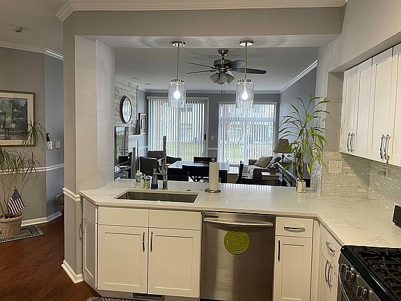Two bedroom, two bath ranch townhouse at Reflections at Hidden Lake in Darien. 1-car attached garage. Remodeled December 2018. Kitchen with white cabinets, quartz countertops, tile backsplash, laminate wood floors, built -in microwave, dishwasher, refrigerator, stove, garbage disposal, breakfast bar with dimmable lighting.Living room/dining room with laminate wood floors, chair rail, crown molding, ceiling fan, gas fireplace with quartz surround and shiplap detail. Master bedroom with carpet and walk-in closet. Master bath with tile floors, quartz vanity top, walk-in shower. Second bedroom with carpet and mirrored closet doors. Hall bathroom with ceramic tile, quartz vanity top and bathtub. Laundry room with white cabinets, washer and dryer. New paint, carpet, lighting and blinds throughout. New storm door.