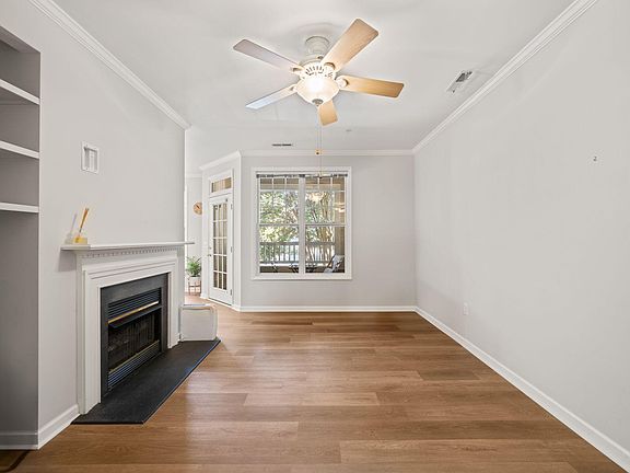 Move-in ready 1 bedroom, 2 full bath condo PLUS sunroom/office with built-in book shelves. This is your opportunity to own a corner unit in a personal coded security door that you enter the building with elevator access. Updates include new water heater 2023, new HVAC 2019, new interior paint 2020 and replaced carpet with new LVP 2022. Featuring a natural gas fireplace, kitchen pantry, electric garbage disposal, large walk in closet in bedroom, two utility closets in hall and a large coat closet in entryway, and laundry room. Enjoy the outdoors on your covered balcony with storage shed. Water, trash and structural maintenance are included in the HOA fees. The community features a peaceful lake and is conveniently located within minutes of Target, Whole Foods, Panera Bread, Chick-fil-A, Home Depot and close access to I-540!
