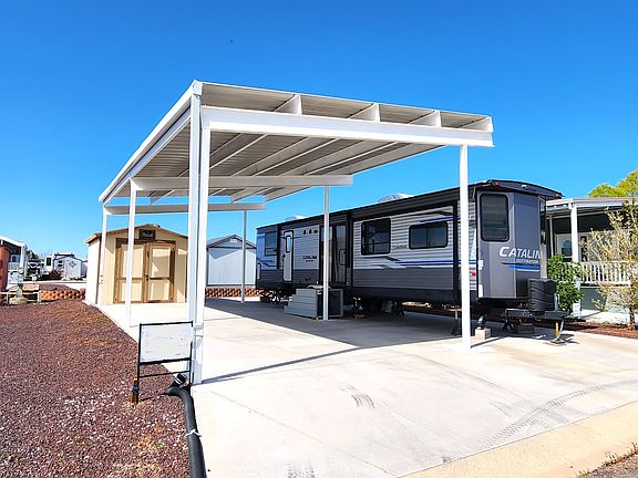 This property is READY for you! Recently improved 40' x 60' ft LOT with a 30' x 60' concrete slab for year round use. A 36' x 20' covered carport is 18' wide clear span and the height is 12' adjacent to your RV and a protective 10' height on the other side and secured to the pad with 4'' steel post for greater strength. Storage is satisfied with a 10' x 12' shed with electricity for lights and outlets (inside & outside) plus power for your golf cart charger. The shed is designed with double doors to fit your golf cart & more. The 2020 Coachmen Catalina -Destination Series Trailer with 3 slide-outs is available for sale for $40,000.
