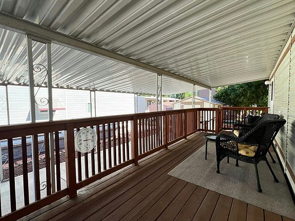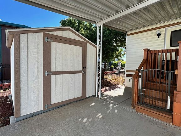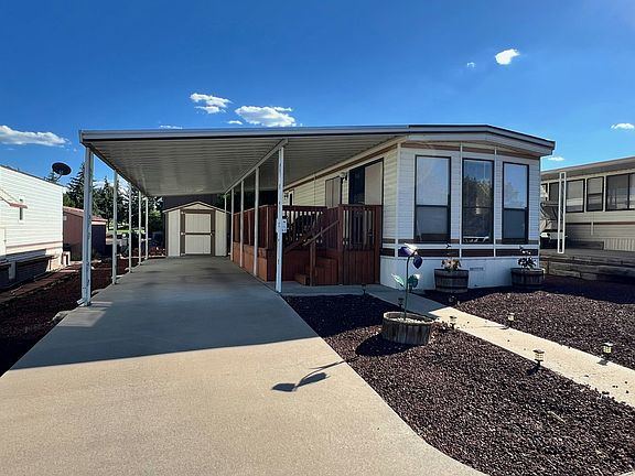 The Juniper Ridge Resort lifestyle awaits! Enjoy golf, swimming, pickle ball, and a schedule of regular activities in the cool climate and beautiful scenery of the Arizona White Mountains. This 1 bedroom, 1 bath home features a large covered carport and expansive gated patio deck. Separate living room and dining areas lead to a kitchen with a wrap around counter, ample storage space, and includes a refrigerator, microwave and range. The detached storage shed houses a washer and dryer, and the well manicured landscaping provides beautiful curb appeal that will make you proud to call this house your home. This home is located in a 55+ gated community.