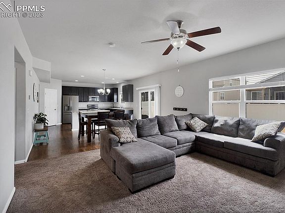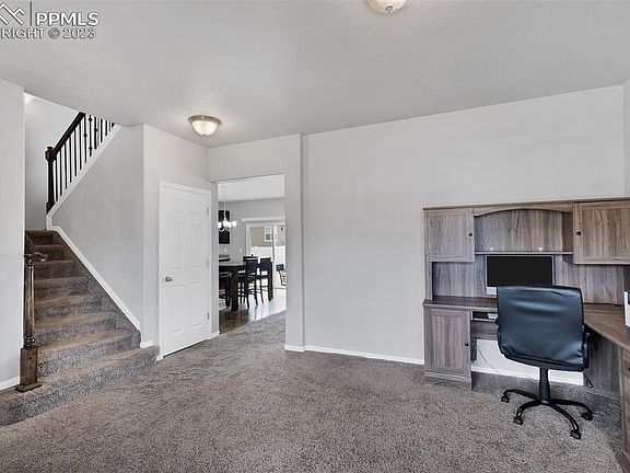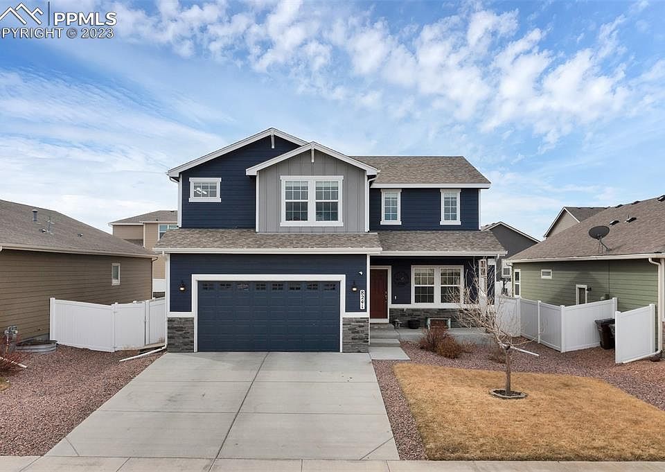 ***This beautiful home complete with a stunning red door stands out amongst all the other homes in the neighborhood.*** When entering the home, you are welcomed by a formal sitting area that will lead you to into a large open living room, dining area and kitchen complete with a walkout. The kitchen is anyone's dream with an oversized island, granite countertops, slate refrigerator and other top of the line appliances. A small wine area is attached to the kitchen and grants easy access to the attached 2 car garage and half bath. Going upstairs you'll find another living room complete with the perfect view of Pikes Peak. All four bedrooms are on the upper level as well as the laundry room. Master bedroom and en-suite bathroom are to die for with a stand-alone shower, large tub, double vanity, huge walk-in closet and enclosed toilet. The additional three bedrooms are of comfy size and complete with large closet space. Back yard is equipped with sprinklers and has beautiful, luscious grass surrounded by rock. Prime position to be able to have a short drive to Schriever AFB, Peterson AFB, as well as Fort Carson. This home is a looker from the beautiful color of the home, the neighborhood, the views, to the comfortable and welcoming indoors.