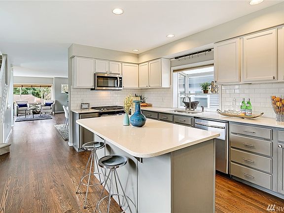 Many modern updates in this spacious & light-filled Green Lake home. Stylish chef's kitchen with island, & expansive great room with warm hardwoods & gas fireplace. Generous master w/large walk-in closet, 5 piece bath, & downtown views. Lower level bedrooms & den. Incredible SW exposure makes this home bright & pleasant year-round. Forced air furnace & A/C. Fenced yard, 2 decks, & detached garage wired for electric vehicle. Quiet dead-end street near park, cafe's & restaurants at Green Lake!