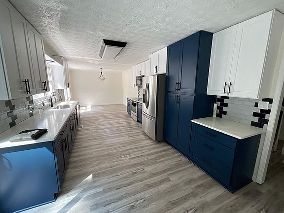 - A modern kitchen equipped with essential appliances including a refrigerator, electric range, dishwasher, and microwave