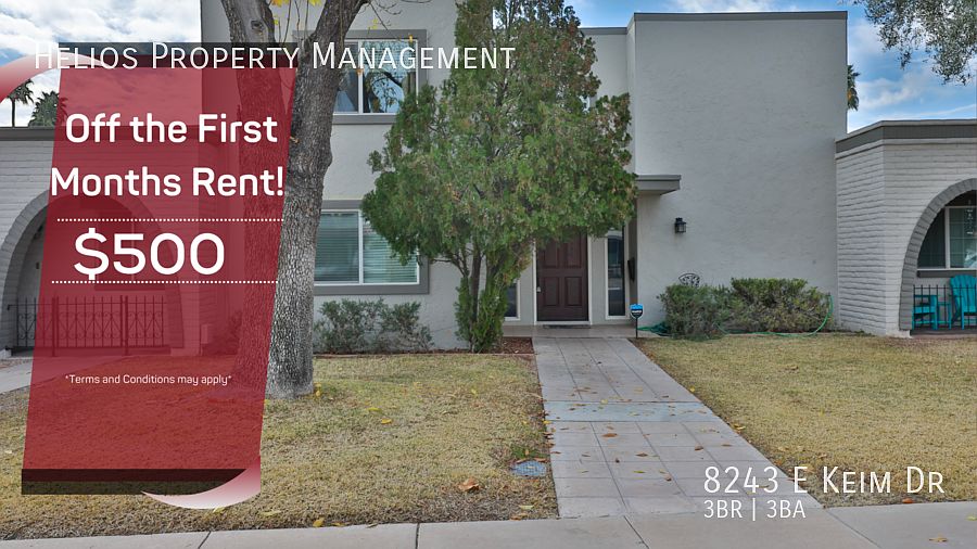 $500 off of your First Month's Rent! Stunning Townhouse in Scottsdale! Located minutes to all of the shopping and dining of Old Town Scottsdale. This recently updated home has a great layout, hardwood flooring in the living areas, nice kitchen has upgraded cabinets and counters and includes Stainless Steel appliances! Quaint backyard has a covered patio and mature landscaping. Enjoy the sparkling community pool without the upkeep! Easy access to Loops 101 and 202. Come see this wonderful home today! $2995.00 per month rent, $2995.00 Refundable Security Deposit, $200 Admin Fee, $55 Application Fee. $29 monthly Energy and Preventative Maintenance Program fee which includes installation of new AC filters every 60-days. Pets considered: 1 dog under 40 lbs, $300 pet fee is nonrefundable +$50 per month pet rent. Facts and figures are provided to the best of Helios Property Management's ability but are not guaranteed to be accurate. You are encouraged to verify any fact or figure materially relevant to you and your decision to rent this home. The Landlord requires coverage of $100,000 of liability coverage per the lease agreement. This requirement can be fulfilled by either a Renters Insurance policy or a Tenant Liability policy Equal housing opportunity. Move in special is with immediate occupancy and well qualified applicants only.