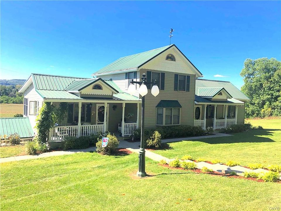 The home has been carefully restored and modernized. Picture sitting on one of the twin porches drinking your morning coffee and planning your day. The large bright eat-in kitchen is a chef's delight with hickory cabinets, corian countertops and new stainless steel appliances. Enter the formal dining room into the distinguished living room with a tray ceiling. Impressive master suite with vaulted ceilings, walk-in closet, dedicated office space/reading room and ensuite. Entertain friends and family in the family room with its cathedral ceilings, stain glass, the indoor/outdoor space created with a wall of slider doors that leads out to the back deck with breathtaking views taking in all the peace and tranquility this home has to offer. The deck has composite decking and a cedar ceiling with beautiful stain glass. There is an additional bedroom with closet and full bath on the first level. On the second level there is two more bedrooms with closets and a full bath. A full finished lower level boasts an entry with a foyer, laundry, kitchen with pantry, family room, game room and two bedrooms with closets and a full bath. Also an attached one car garage.