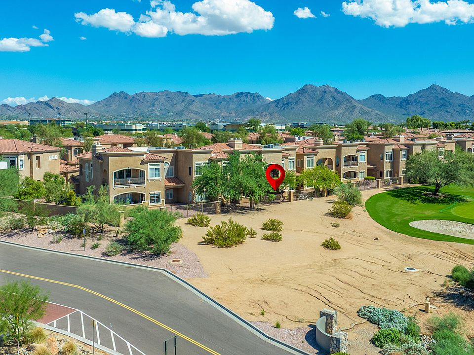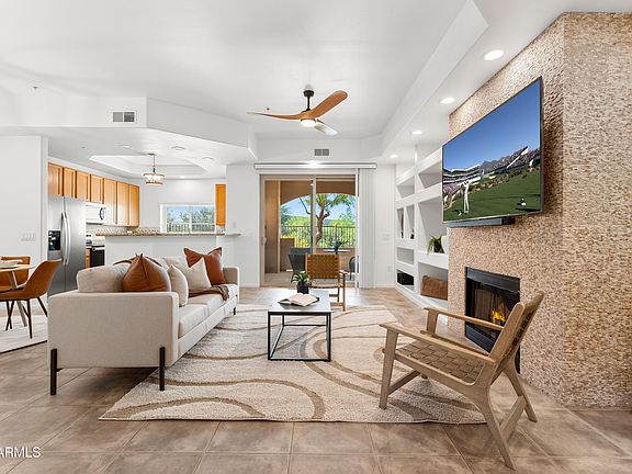 Beautifully updated ground-floor 2 bed, 2 bath condo in the gated community of Montana Del Sol, overlooking TPC Scottsdale Champions Course and steps away from TPC Stadium Course as well the new Draft Kings Sports Book and Restaurant! Enjoy the 9th green golf course views from your private covered patio. This move-in ready unit features granite countertops, stainless steel appliances, a stacked stone fireplace, and no interior steps. Community amenities include gated entrance, heated pool & spa, BBQ area, and lush landscaping. HOA covers exterior maintenance, water, sewer, trash, and more. Ideal for full-time living or lock & leave with custom steel security door. Near Loop 101, shopping, dining, and world-class golf. Buyer to verify, no rental restrictions on rental length terms.