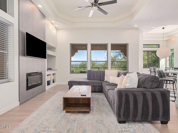 New price on this turn-key, 3 bdm Scottsdale townhome w/ 2 car garage in PRIME location, an easy walk to the Phoenix Open! Unit fully furnished with NO short term rental restrictions! Spacious kitchen w/ stainless steel appliances, breakfast bar and eat in kitchen. Home is light & bright w/ soaring ceilings, large living room w/ fireplace & bar area, and beautiful mountain views. Primary bedroom bath w/ tiled shower, double sinks and his & her closets. 2 nice size additional rooms w/ ceiling fans and large closets (flooring for these rooms in garage). Relax on your private covered patio overlooking Scottsdale Sport Complex . Enjoy a 2 car garage with indoor access. Wonderful location offers an abundance of golf, hiking and fine dining options, w/ Sky Harbor about 20 minutes away.