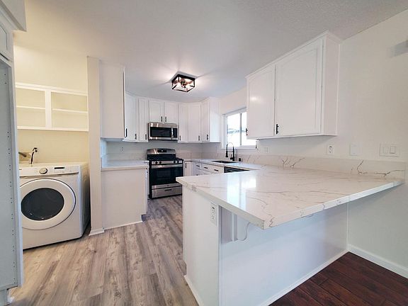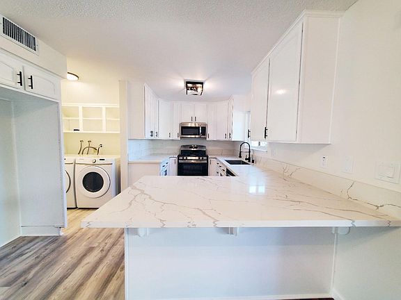 This beautiful Buena Park home features new interior paint of white bright modern tones, recessed lighting, upgraded laminate vinyl plank flooring. The windows allow an abundance of natural light to illuminate the open floor plan. The living room flows seamlessly into the dining area with a large sliding door that opens to the back balcony. The kitchen impresses with white cabinetry, Quartz countertops and stainless-steel appliance includes a gas single over range, microwave and dishwasher. The half bath and inside laundry area completes the downstairs. Up the staircase is the spacious primary bedroom ensuite with a private bathroom, Granite vanity countertop and shower. The secondary bedrooms with new carpet and windows with plenty of natural lighting. A 2-car detached garage, brand new central/heat unit, brand-new front-loading washer & dryer included, new door locks on the front and patio door. Nearby shopping, restaurants, access to the 91 and 5 freeways. Must see this move in ready home just waiting for you! Owner pays association dues, tenant pays all utilities.