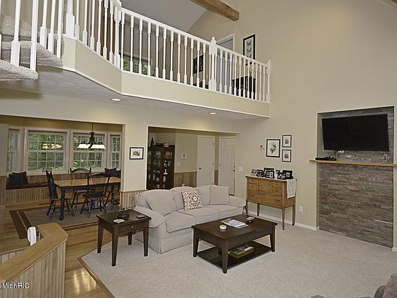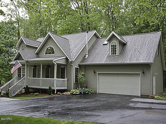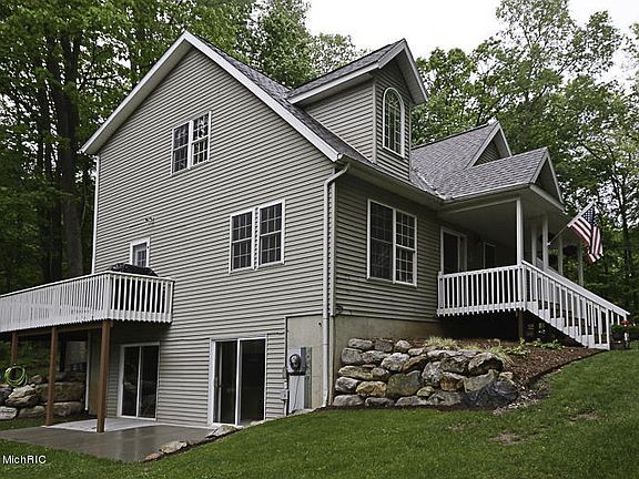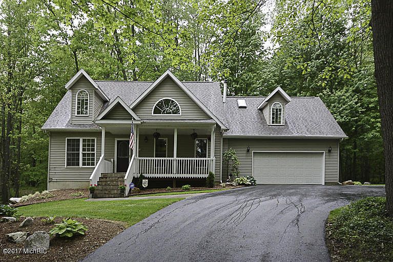 Wow, what a place! 5+- fantastic wooded acres with a variety of majestic mature trees. Home surrounded by farms and open lands. Winding asphalt drive to classy cape cod with roofed front porch and a wrap around (12x24) deck with 2 entrances. Open floor plan with vaulted ceilings,lots of windows for natural light,skylights & a peaceful loft area. Kitchen has oak cabinets, tile floor, & a pantry. The dining area is huge with plank flooring & a 10 foot bench seat wrapped in a mull of windows. Right off the garage is a main floor laundry and full bath. Master bedroom is huge along with a bath that includes a whirlpool tub. Newer roof shingles, central A/C, furnace, wood burner add on. Walkout basement to patio.Plumbing in basement for full bath to be completed. 8 min drive from H-Creek school